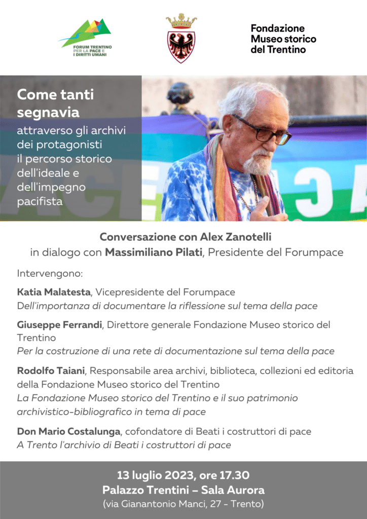Sulla stretta correlazione tra impegno di pace, difesa dei diritti umani e pratica archivistica come strumento di trasformazione e cambiamento si soffermeranno anche, in apertura, Katia Malatesta – vicepresidente del Forum trentino per la pace e i diritti umani, Giuseppe Ferrandi – direttore generale della Fondazione Museo storico del Trentino, Rodolfo Taiani – responsabile area archivi, biblioteca, collezioni ed editoria della Fondazione Museo storico del Trentino, e don Mario Costalunga – cofondatore di Beati i costruttori di pace