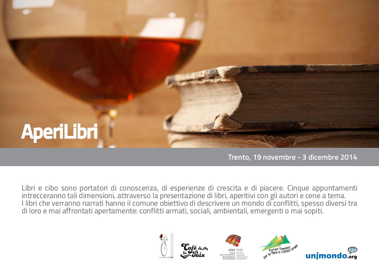 Libri e cibo sono portatori di conoscenza, di esperienze di crescita e di piacere. Cinque appuntamenti intrecceranno tali dimensioni, attraverso la presentazione di libri, aperitivi con gli autori e cene a tema. I libri che verranno narrati hanno il comune obiettivo di descrivere un mondo di conflitti, spesso diversi tra loro e mai affrontati apertamente: conflitti armati, sociali, ambientali, emergenti o mai sopiti.