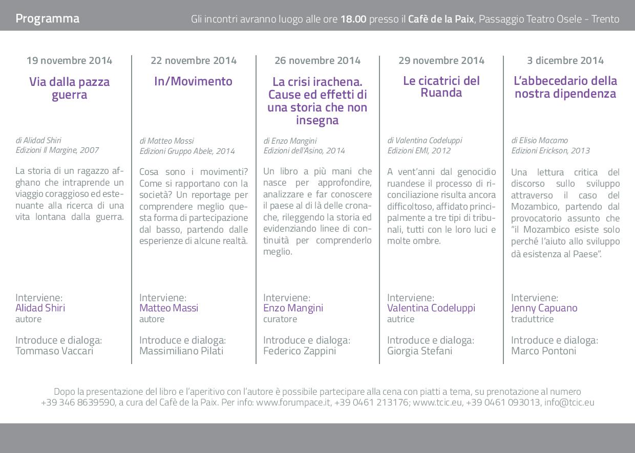 Gli incontri avranno luogo a partire dalle ore 18.00 presso il Cafè de la Paix, Passaggio Teatro Osele - Trento