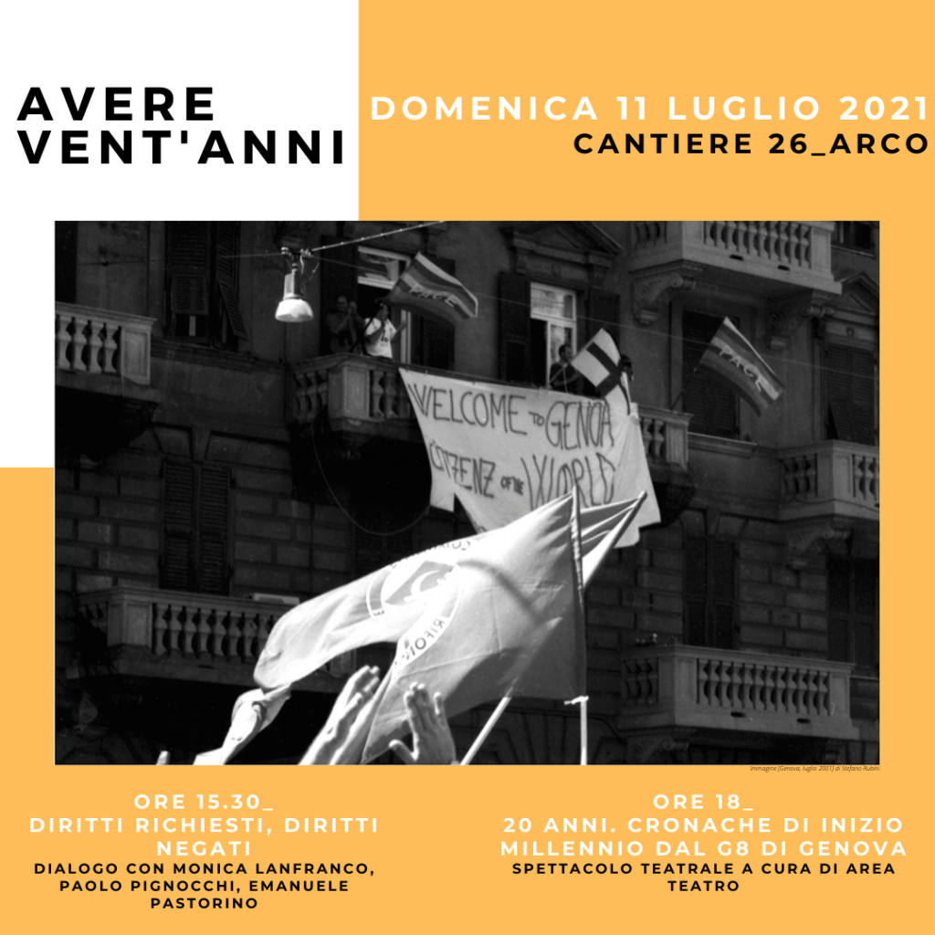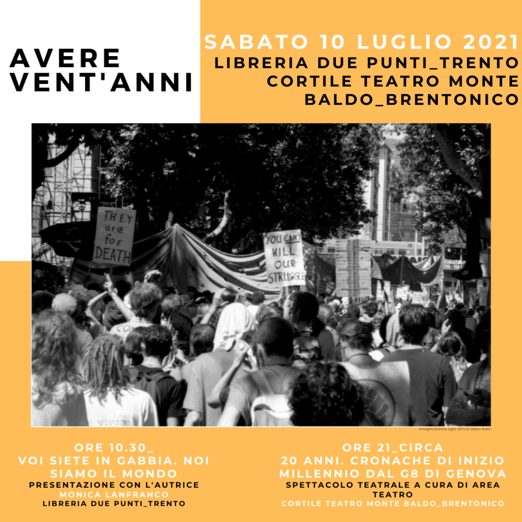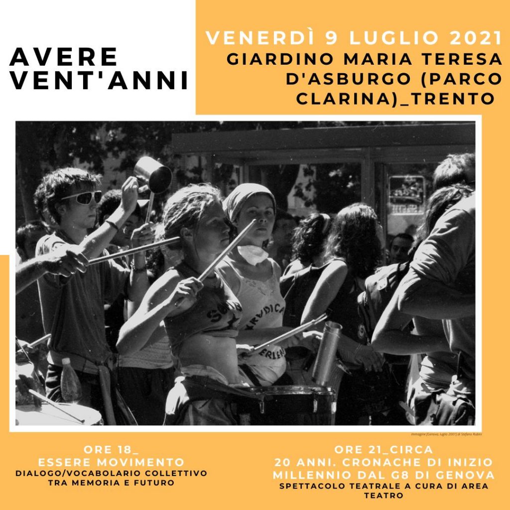 Avere vent’anni è una rassegna e un’occasione, pensata da ARCI del Trentino, libreria due punti, CGIL del Trentino, Cantiere 26, Forumpace, Comuni di Trento, Brentonico e Arco, per riflettere ancora - a 20 anni dall’estate 2001 - sui fatti di Genova. Per farlo, il 9, 10 e 11 luglio prossimi passerà dal Trentino lo spettacolo teatrale “20 ANNI. Cronache di inizio millennio dal G8 di Genova“, una produzione di Area Teatro che ripercorre quei giorni.