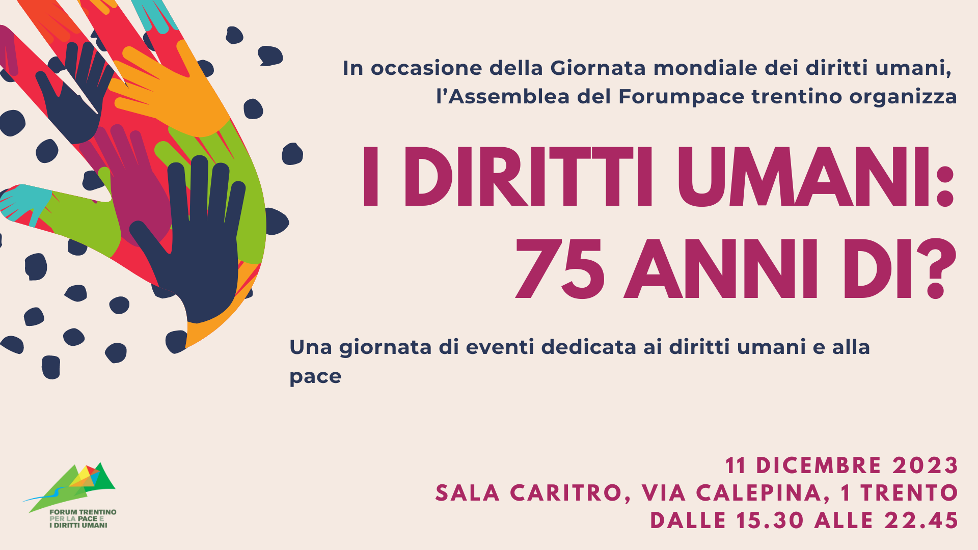 Per maggiori informazioni sull’evento dell’11 dicembre “I Diritti Umani: 75 anni di?” è a disposizione lo staff del Forumpace (telefono: 0461 213176, mail: [email protected]).
